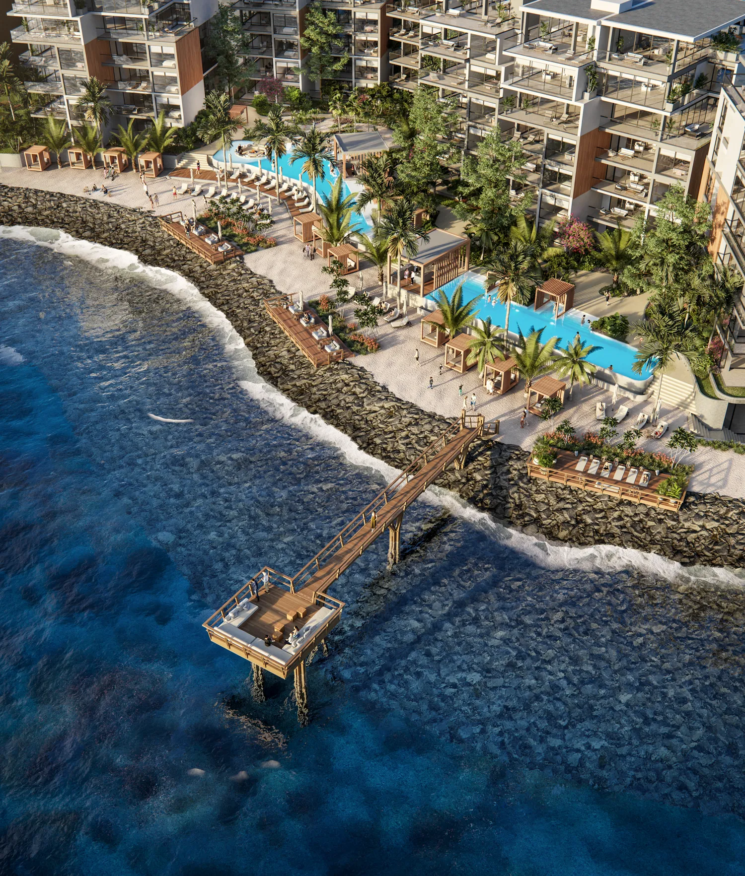 Social areas at The Palms Beach Resort include more than 120 meters of private beachfront. Residents can enjoy infinity-edge recreational pools and oceanfront cabanas. Moreover, the project features meditation areas, firepits, and a professional gym. For nature lovers, the “Lookout” observation deck offers a perfect spot for dolphin watching. The wellness center also integrates spa services and a sauna for total relaxation.